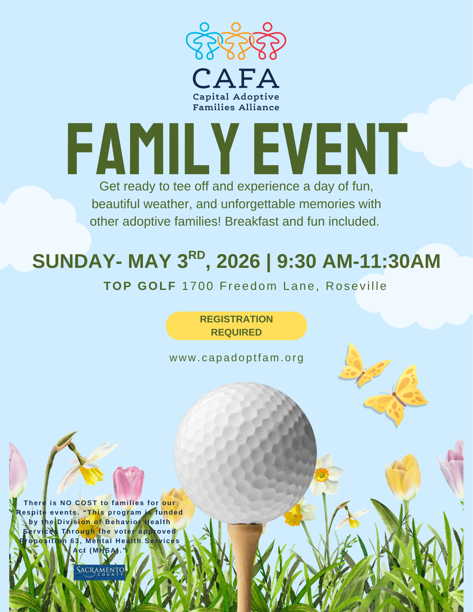*To be eligible you must be an adoptive parent that is living in Sacramento County or has adopted through Sacramento County. Event is subject to change or cancellation.